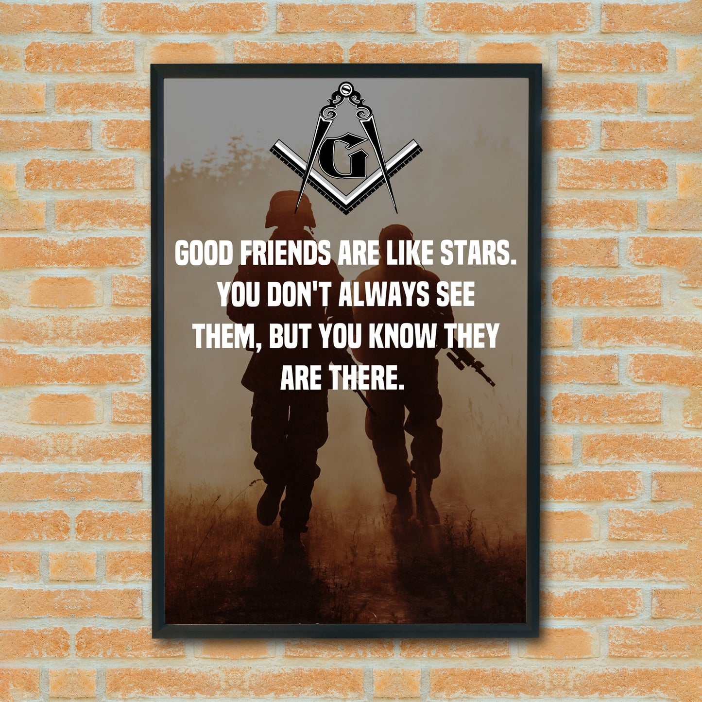 This heartfelt Masonic poster captures the unbreakable bond between true friends, with a silhouette of two companions walking side by side beneath the Square & Compass — a symbol of loyalty, trust, and timeless fraternity.