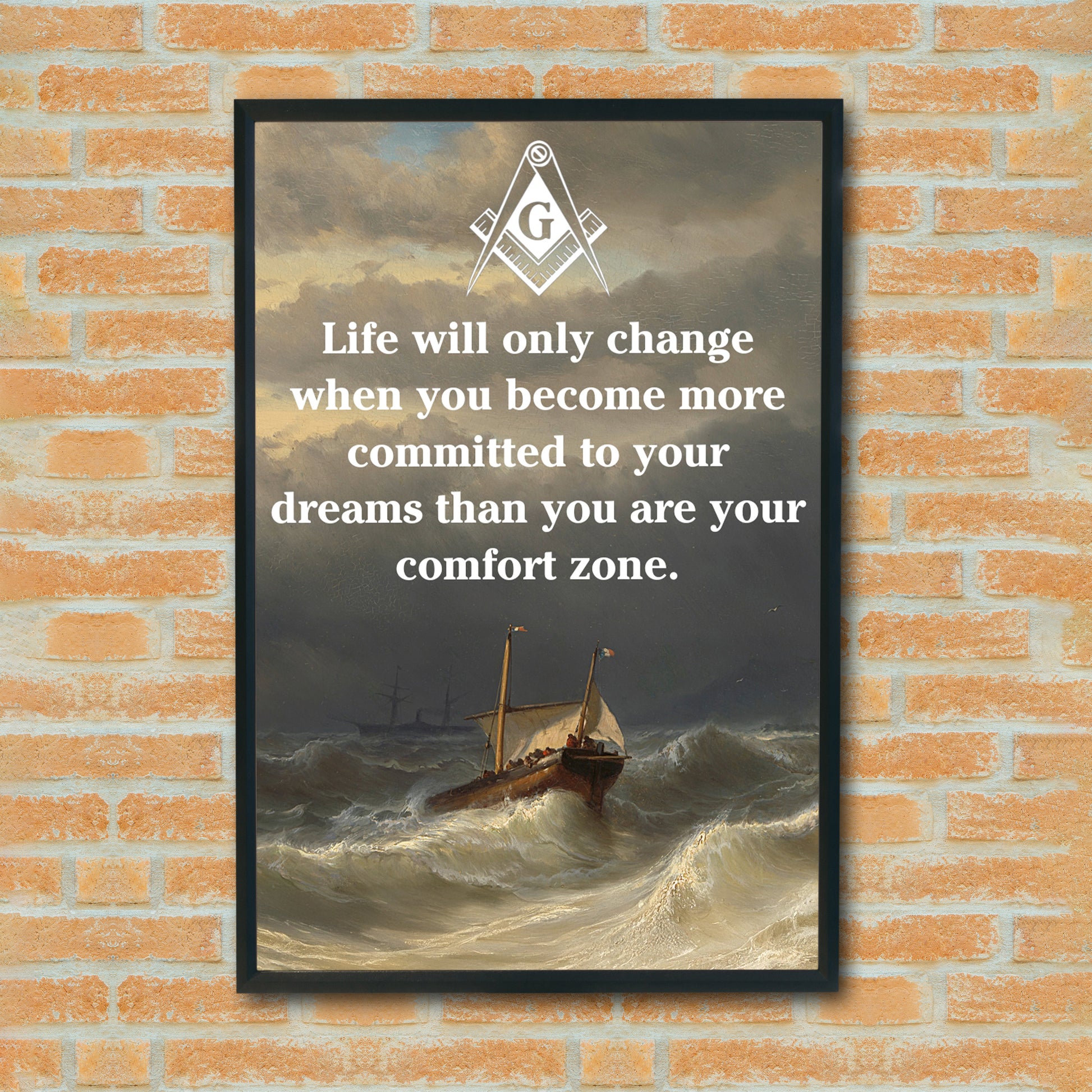 This powerful Masonic poster depicts a lone ship navigating turbulent waters beneath a stormy sky — a metaphor for the inner and outer journeys we take as Masons.